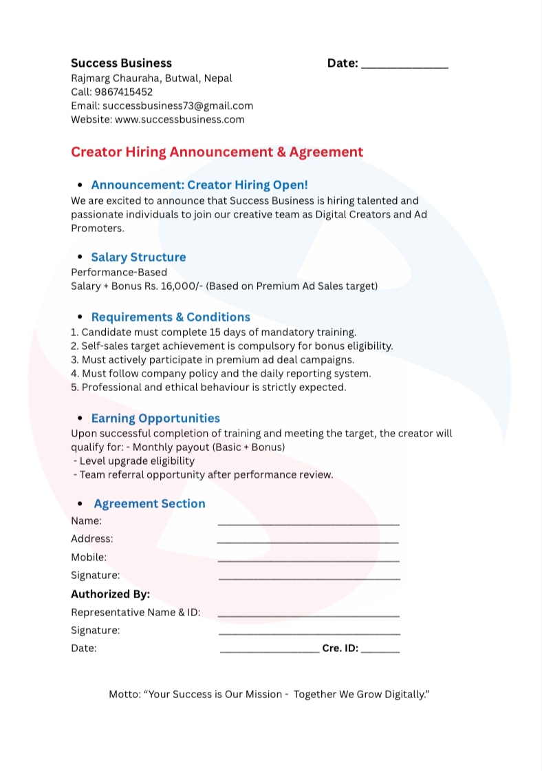 We are excited to announce that Success Business is hiring talented and passionate individuals to join our creative team as Digital Creators and Ad Promoters.