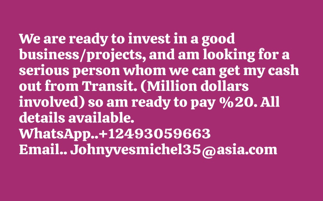 and am looking for a serious person whom we can get my cash out from Transit. (Millions involved) so am ready to pay %20. All details available.